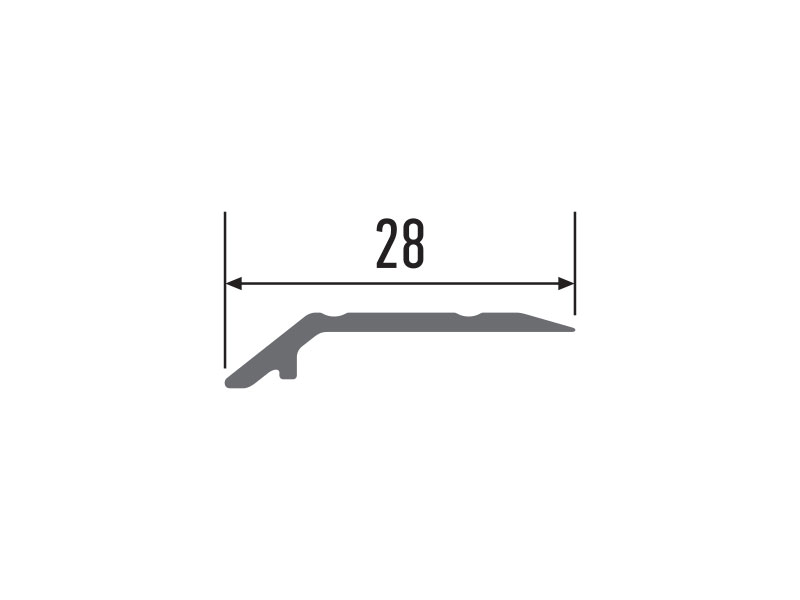 Алюминиевый профиль шириной 28 мм имеет продольную жесткость. Применяется для соединения стыков между плиткой, ламинатом, паркетом, ковровыми покрытиями имеющими перепад от 2 до 4 мм.