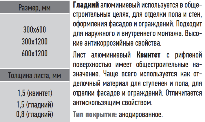 Гладкий алюминиевый используется в общестроительных целях, для отделки пола и стен,